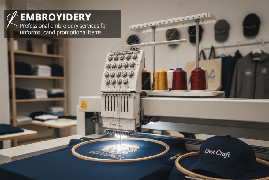 Detailed embroidered branding for wearables.
